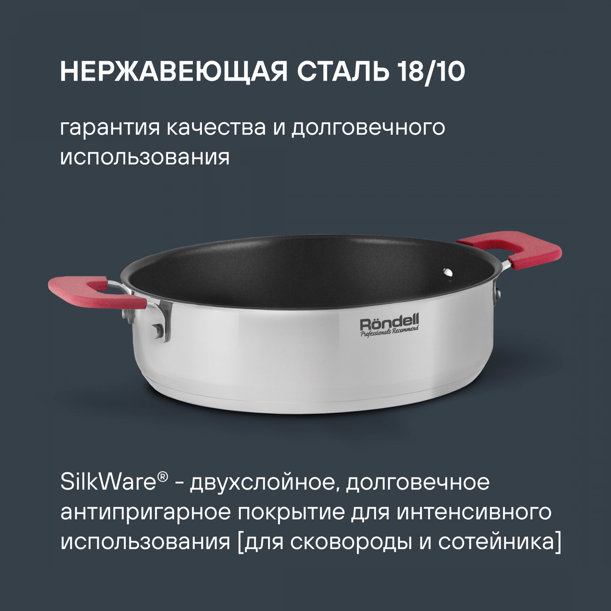 Материал: высококачественная нержавеющая сталь 18/10. SilkWare® - двухслойное антипригарное покрытие для интенсивного использования (для сковороды и сотейника). Толщина стенок: 0,5 мм. Толщина дна: 4,5 мм; 5,0 мм; 4,0 мм. Преимущества: складная ручка на плоской крышке для экономии пространства;