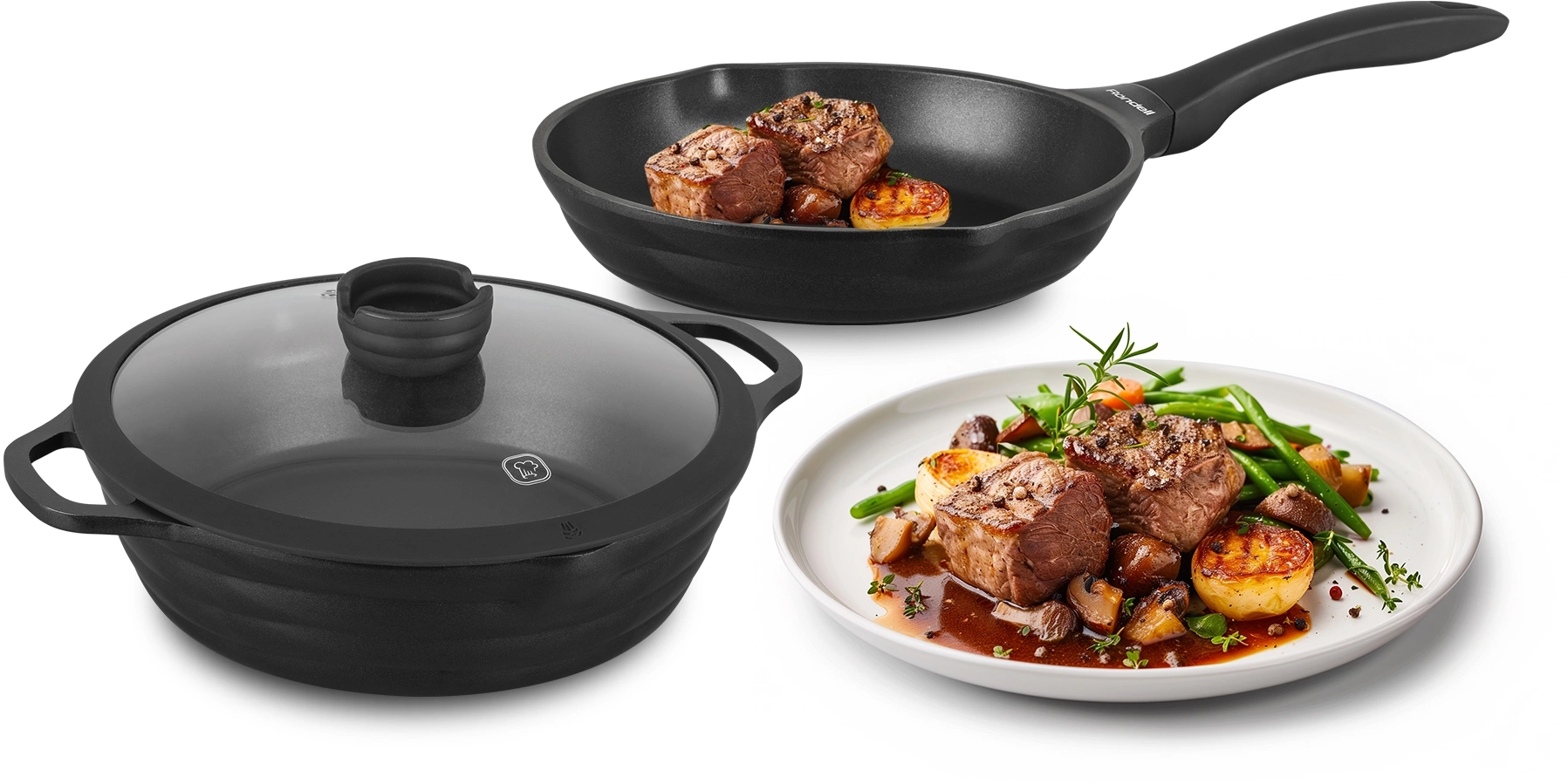 Посуда изготовлена из литого алюминия, известного своей высокой теплопроводностью, а значит рекомендуется для длительного томления блюд. Антипригарное покрытие Xylan® Plus: превосходные антипригарные свойства, нельзя использовать металлические лопатки.