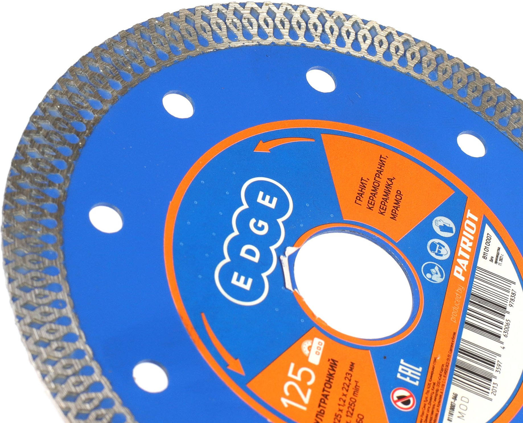 Диск алмазный ультратонкий Турбо 125x22.23х1.2 мм. EDGE by PATRIOT 811010007 предназначен для разрезания керамогранита, гранита, мрамора, керамики с использованием ручных резчиков и плиткорезных станков. Ультратонкая, Х-образная режущая кромка обеспечивает чистый рез без сколов.