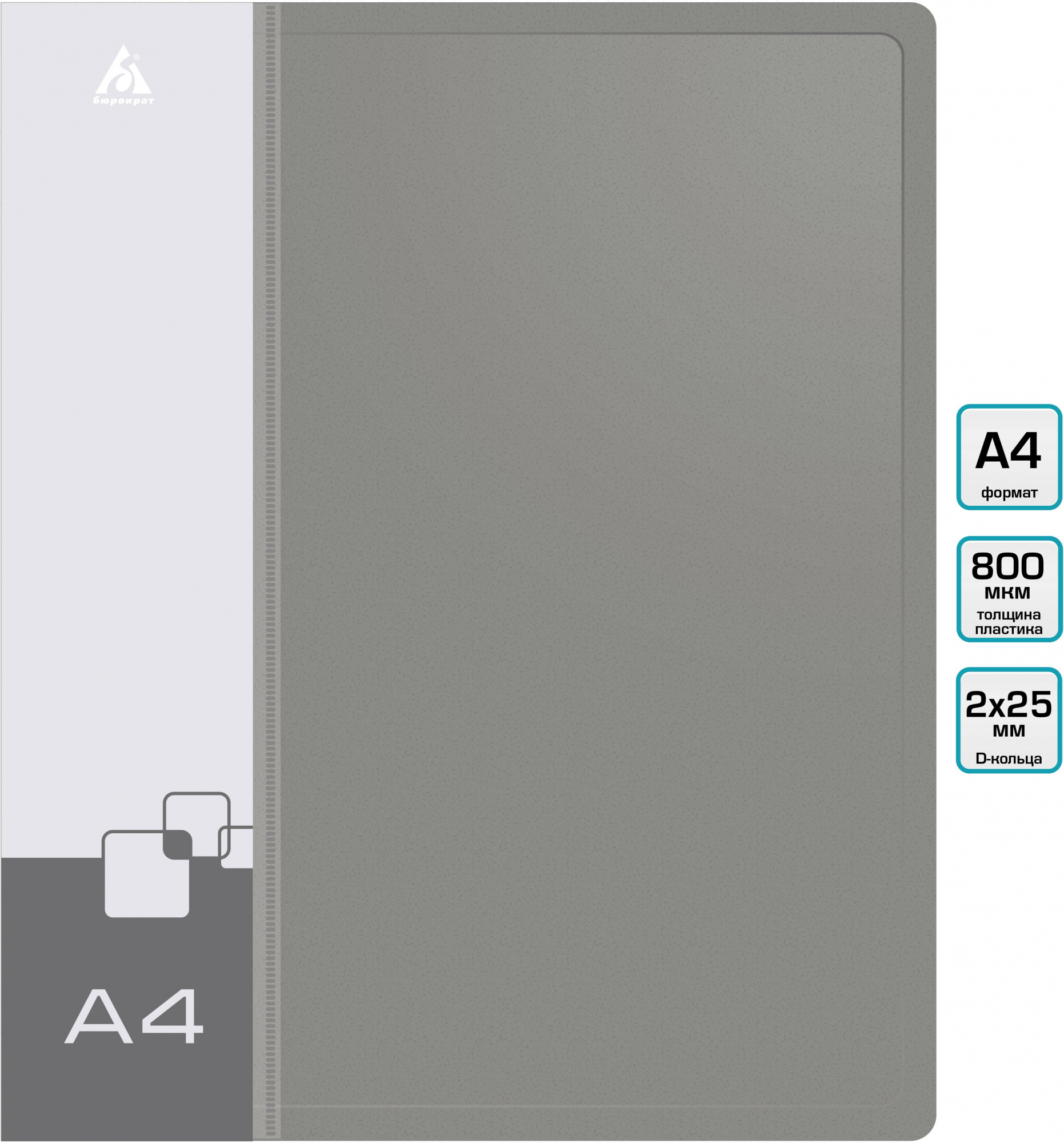 Папка на 2-х D-кольцах Бюрократ -0840/2DGREY A4 пластик 0.8мм кор.40мм внутр. с вставкой серый