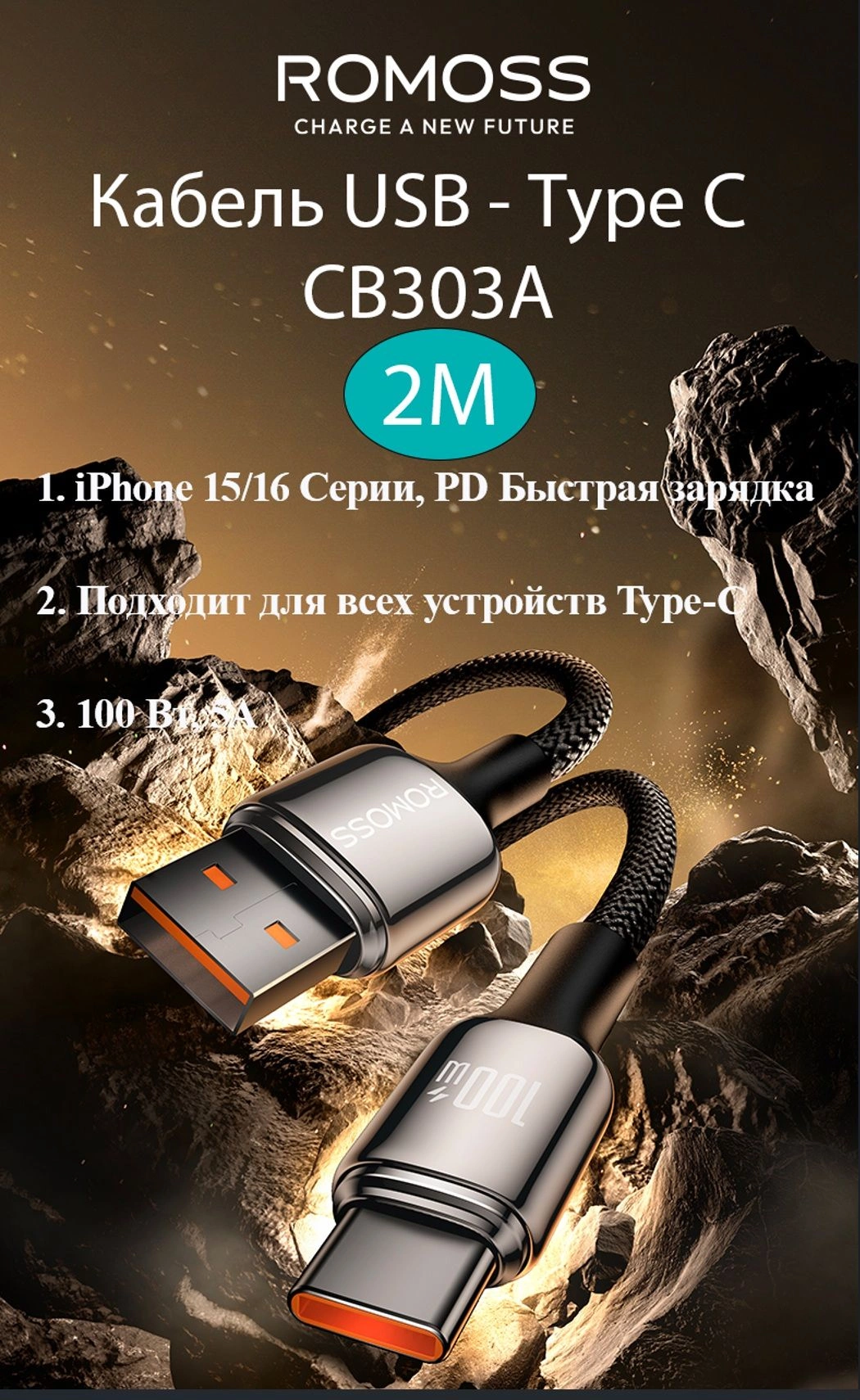 Кабель Romoss CB303A 1746962 USB (m)-USB Type-C (m) 2м черный