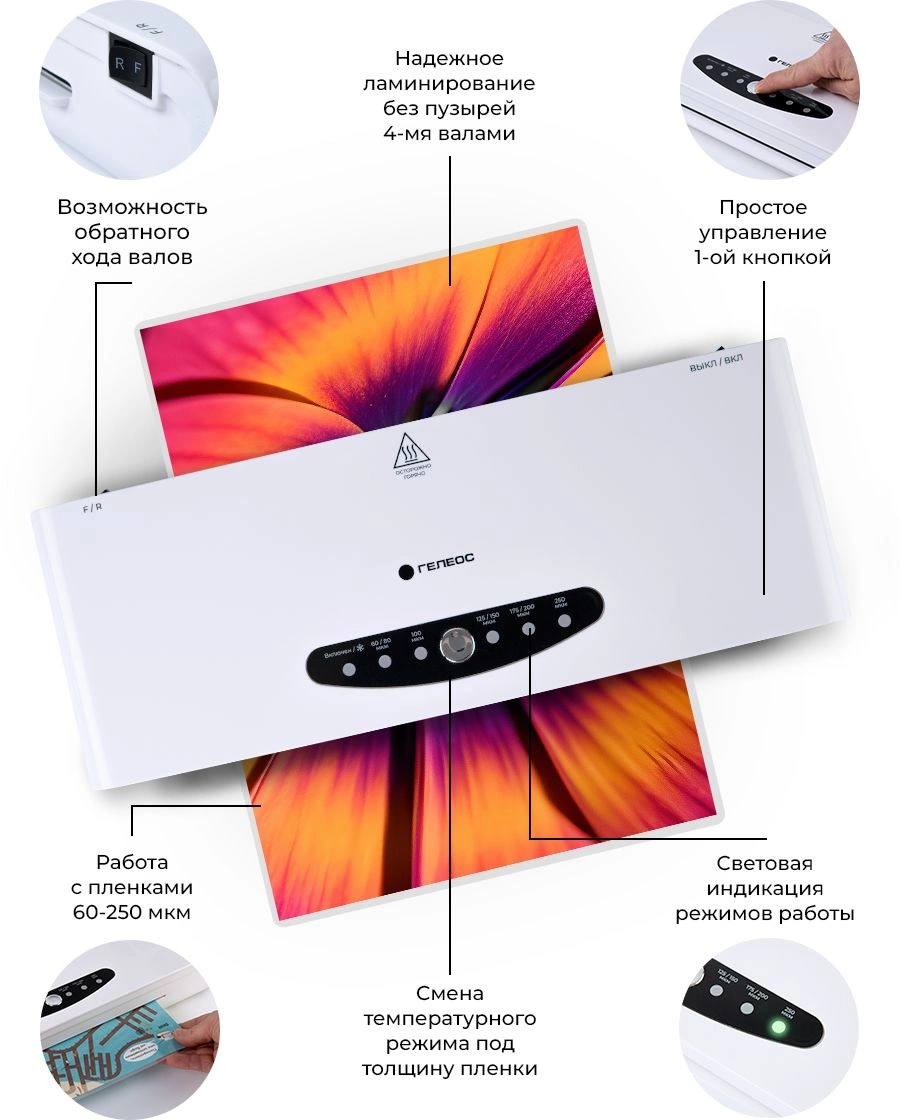 Ламинатор Heleos ЛМА44В белый/черный A4 (60-250мкм) 30см/мин (4вал.) хол.лам. лам.фото реверс
