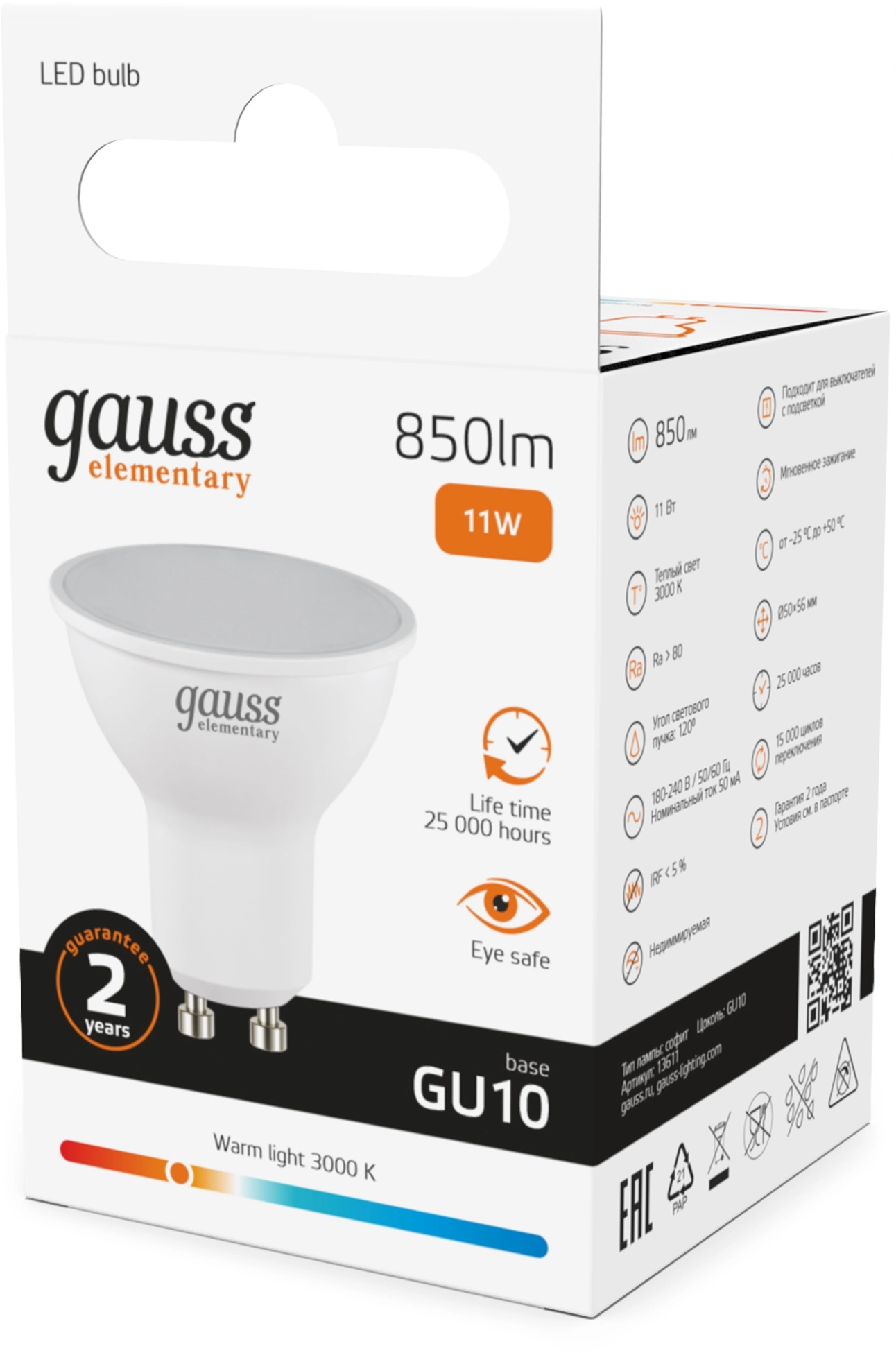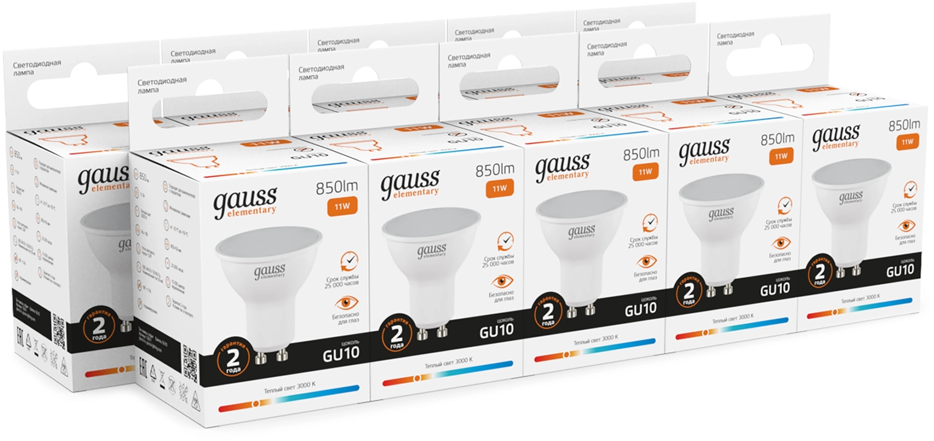 Лампа светодиодная Gauss Elementary 13611 11Вт цок.:GU10 софит 220B св.свеч.бел.теп. (упак.:10шт)